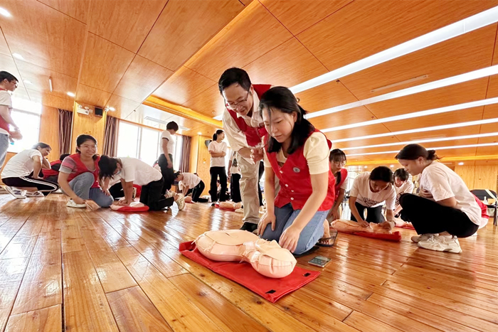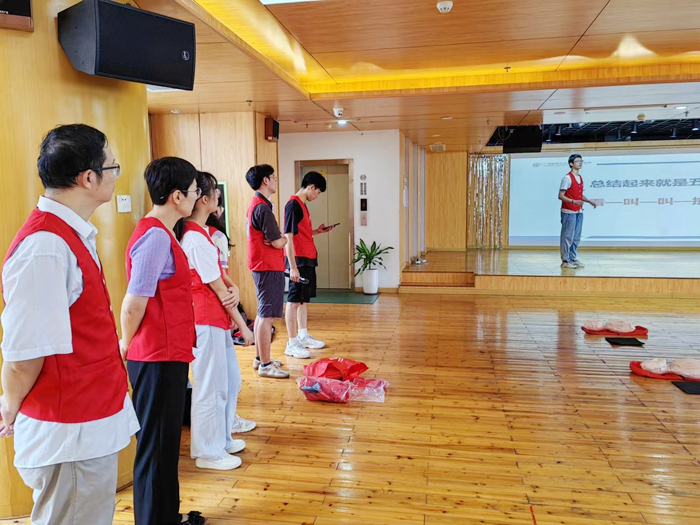 活动伊始,医院临床技能协会会长郭纪旭讲解了急救技巧并示范心肺复苏,即胸外按压和人工呼吸救助。随后,公司教工第一党支部志愿者们和协会会员分组一对一为布蕾幼儿园的老师进行教学实操指导,确保现场每一位老师和员工都学会心肺复苏的方法。接着会长郭纪旭分享了海姆立克急救法的操作以及常见意外、紧急情况的处理方法。最后,还讲解了AED(除颤仪)的使用。在志愿者们的指导下,布蕾幼儿园教职工们都能够规范地利用人体模型进行模拟的救护。