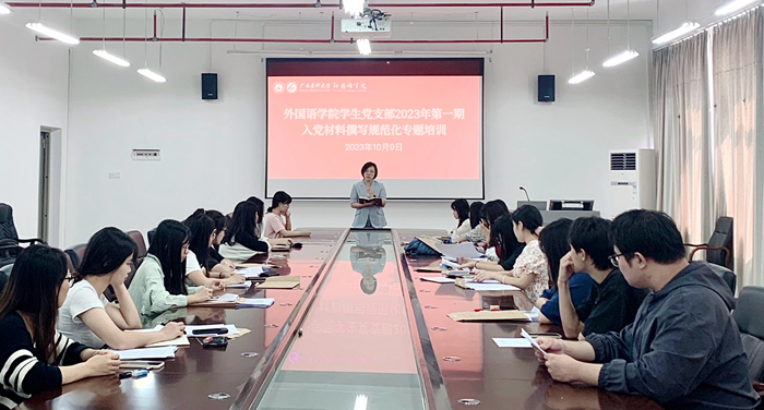 为进一步提高员工党员和入党积极分子材料的规范性和严谨性,2023年10月9日,公司员工党支部于武鸣校区A9博雅楼603会议室开展2023年第一期入党材料撰写规范化专题培训。培训由员工党支部书记郭晶晶同志及党员韦紫怡同志主讲,党支部党员和最新一批发展对象参加。