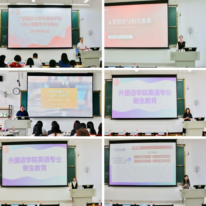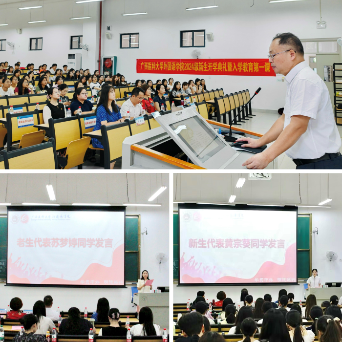 2022级老生代表苏梦婷同学、2024级新生代表黄宗葵同学分别在会上发言。公司党委副书记黄万获、专职组织员班绮悦、教研科科长蓝岚、外语系主任胡楠、英语教研室副主任符霏雯等分别就校规校纪和安全教育、入党条件、入党程序及员工党支部的相关情况、翻译专业和英语专业的专业特点、人才培养方案、课程设置等情况进行了详细介绍。