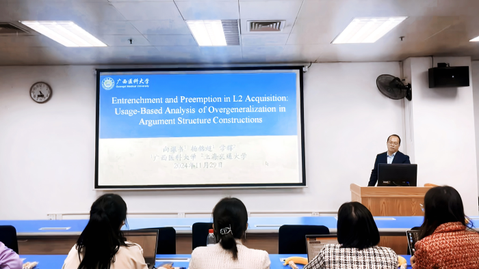 首先,向博士围绕团队今年的最新研究成果“Entrenchment and Preemption in L2 Acquisition: Usage-Based Analysis of Overgeneralization in Argument Structure Constructions”进行汇报。该研究考察了250名中国英语学习者克服论元结构构式泛化过程的制约因素,提出了在论元结构构式的习得过程中,二语学习者通过调用统计概率偏向信息来制约论元结构构式的泛化的观点。随后,杨铭超就团队今年发表在Applied Psycholinguistics(JCR分区:1区)上的一篇文献(Statistics Versus Semantics: Retreating from the Dative Overgeneralization Errors by Chinese EFL Learners)进行汇报。该文献探讨了中国英语学习者克服英语与格转换构式泛化过程中的制约因素,提出了二语学习者在克服与格转换构式的泛化问题时不仅依赖统计概率偏向信息,还同时调用了语义信息的观点。翻译专业硕士生杨铭超的汇报展现了良好的科研阅读能力和批判思维,赢得了与会师生的一致好评。