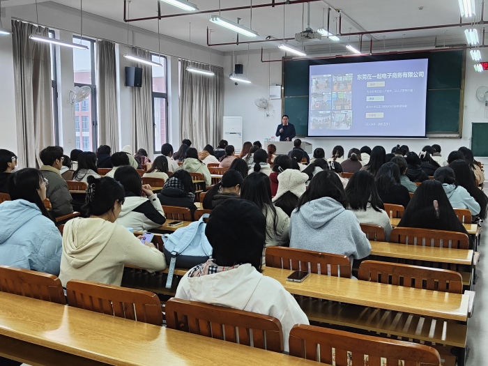 东莞在一起电子商务有限公司校企合作部张腾先主任就公司结构、行业前景及发展空间、跨境电商工作内容及实习就业一体化等方面进行了介绍,为毕业生提供了OPT奥普托企业、东莞市今隽机械有限公司、华人行等五家单位共30多个岗位。张腾先主任深入浅出地剖析了当前跨境电商的发展形势,并为参加此次订单班的同学展示了该公司跨境电商技能学习平台,鼓励同学们认真参与学习。张腾先主任还与同学们进行互动交流,细致解答了同学们关于企业招聘等方面的困惑,同学们认真聆听,受益匪浅。