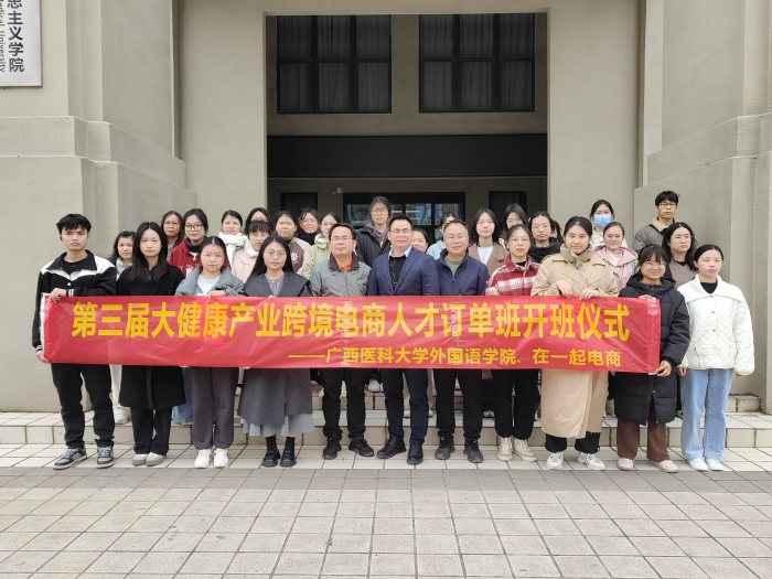 外国语公司党委书记韦建辉进行开班动员讲话,他祝贺公司第三届大健康产业跨境电商人才订单班顺利开班,希望同学们提前做好规划,找准定位,积极投身大健康产业跨境电商领域,不断提高求职竞争力。