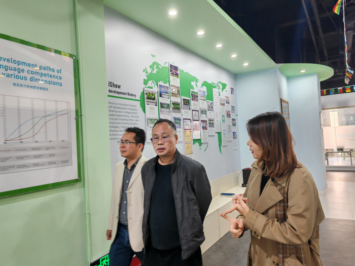 实地参观了ishow国际英语(南宁校区)的教学环境,体验纯英文氛围,教室、设备及学员成果,ishow国际英语(南宁校区)董事长彭丽珊详细介绍了企业的发展轨迹,韦建辉对ishow国际英语取得的卓越成就表达了诚挚敬意与高度认可,并向企业详细介绍了公司的专业布局,突出公司在英语、翻译、跨文化交际等专业方向上的特色优势,阐述了以实践为导向、注重培养员工综合语言运用与专业素养融合的人才培养模式,以及近年来公司毕业生在就业市场上的亮眼表现,尤其在教育、翻译等领域的广泛适应性与竞争力。