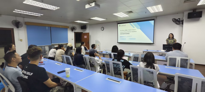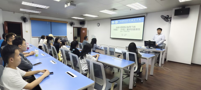 23级研究生邹禹喆与赵润婷分别对自己的论文撰写工作进行了汇报。邹禹喆以“功能对等理论指导下的《暖医》(节选)翻译实践报告”为主题,围绕框架探讨、选题介绍、翻译过程、案例分析等内容进行了汇报。本期主评硕导陆昌兴副教授对论文内容和进步表示肯定,并就“人文性”相关领域同在场同学展开热烈讨论。王晓惠教授从标题、目录、严谨性、学术性、分类等角度对论文进行指导。赵润婷以“Hereditary Diffuse Gastric Cancer: Updated Clinical Practice Guidelines英译汉翻译实践报告”为主题,在赖斯的文本类型理论的指导下,基于翻译任务、过程、文献综述和案例分析进行汇报。陆昌兴副教授从文献综述作为切入点,针对不足之处逐一进行指导,王晓惠教授从多角度进行了补充。硕导们的指导点评使同学们进一步掌握了论文撰写方法,激活科研创新思维路径。