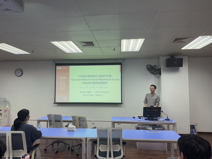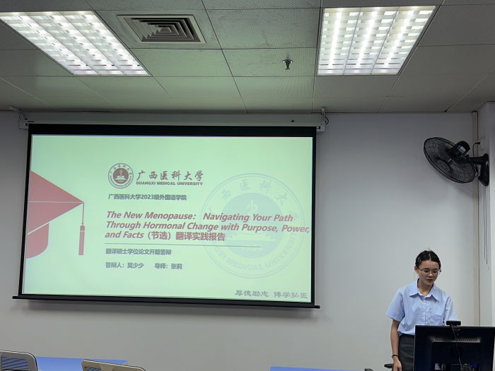 莫少少同学以“The New Menopauese: Navigating Your Path Through Hormonal Change with Purpose, Power and Facts(节选)翻译实践报告”为主题,充分利用医学翻译术语库和平行文本等参考资料,在纽马克的交际翻译理论指导下完成翻译实践报告。本期主评硕导李丹副教授认为其案例中句子和语篇翻译分析契合实际,但要注意补充译后反馈,确保译文质量风格统一,上下文逻辑完整等问题。周昌站同学以“CAT联合语料库对口腔医学专著Pearls and Pitfalls in Oral and Maxillofacial Surgery(节选)英汉翻译实践报告”为主题,通过结合CAT+MTPE模式,用语料库来辅助翻译实践,从五个方面进行了精彩的汇报。李丹副教授肯定了他的翻译选材实践性强,建议补充说明选材对临床指导的应用价值和意义,并注意词汇分类的严谨性。胡楠副教授建议进一步查询词汇空缺分类中的专有名词,确保翻译的准确性和临床应用性。