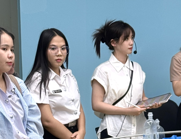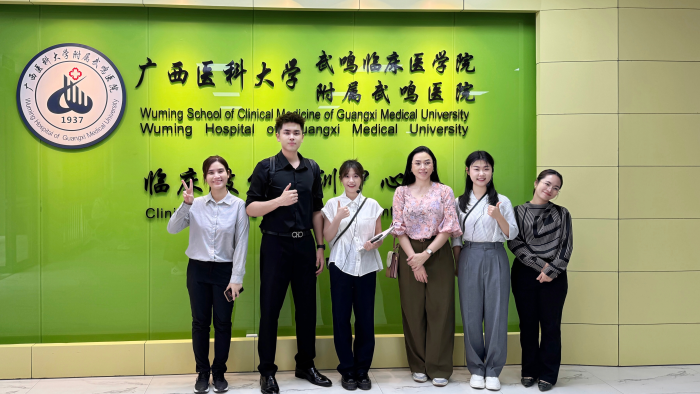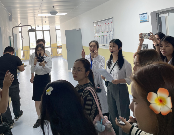 沈语嫣、周柳梅、王泳善三名研究生志愿者全程参与泰国玛哈沙拉堪大学调研交流活动的翻译工作,包括陪同翻译及调研交流活动的交传。座谈会上,沈语嫣担任主持,王泳善负责会议交传,周柳梅协同完成发言翻译任务;走访临床技能培训中心、急诊科等科室时,周柳梅负责临床技能中心与急诊科翻译,沈语嫣对接临床医学研究中心,王泳善则承担健康管理部与全科医疗科翻译。三位翻硕学术对医学科室术语及公司背景资料十分熟悉,并以专业素养为代表团提供精准服务,展现公司医学翻译人才的国际化水平。